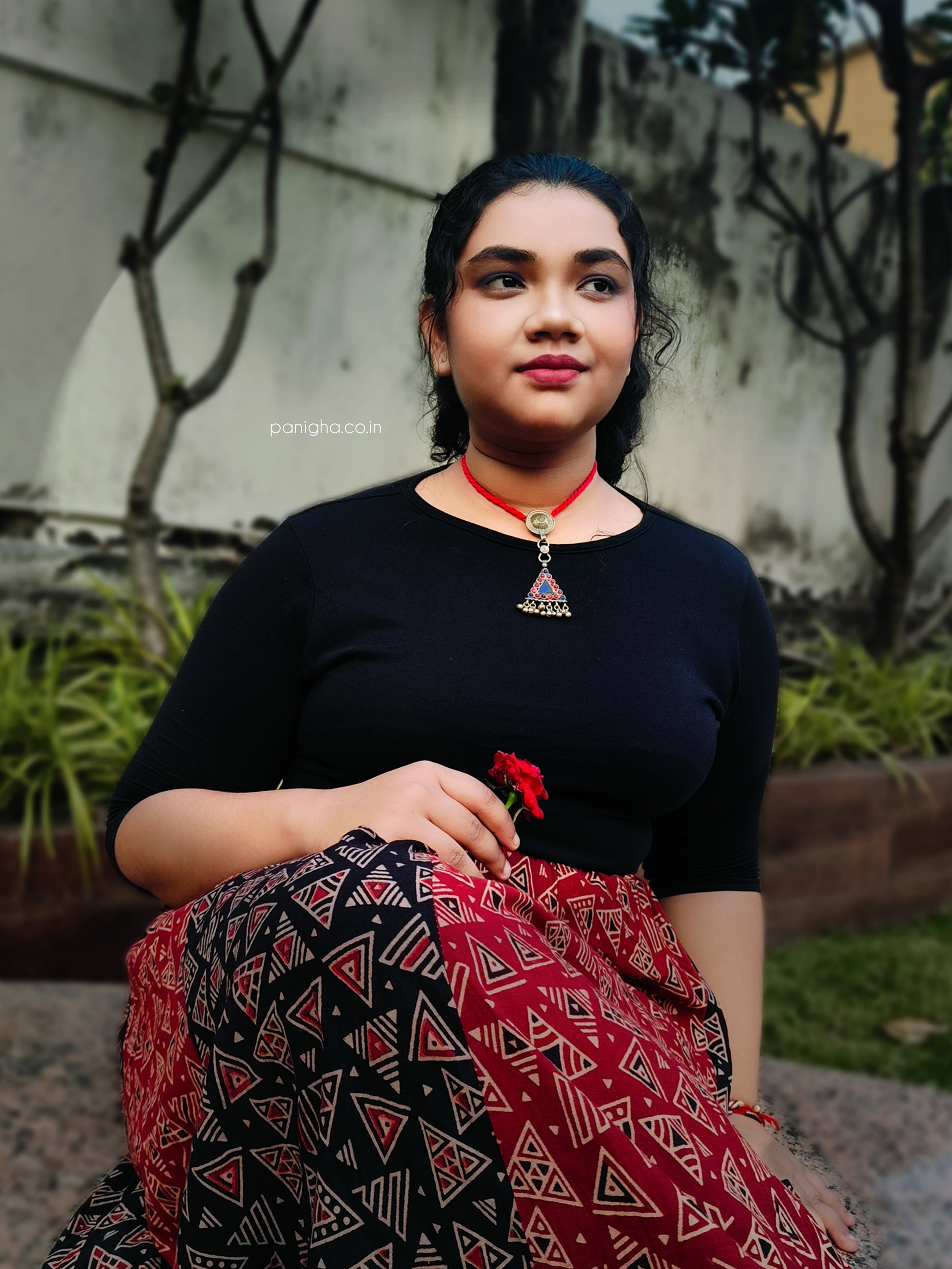 - Neckline: Adjustable braided red dori with tie-up closure