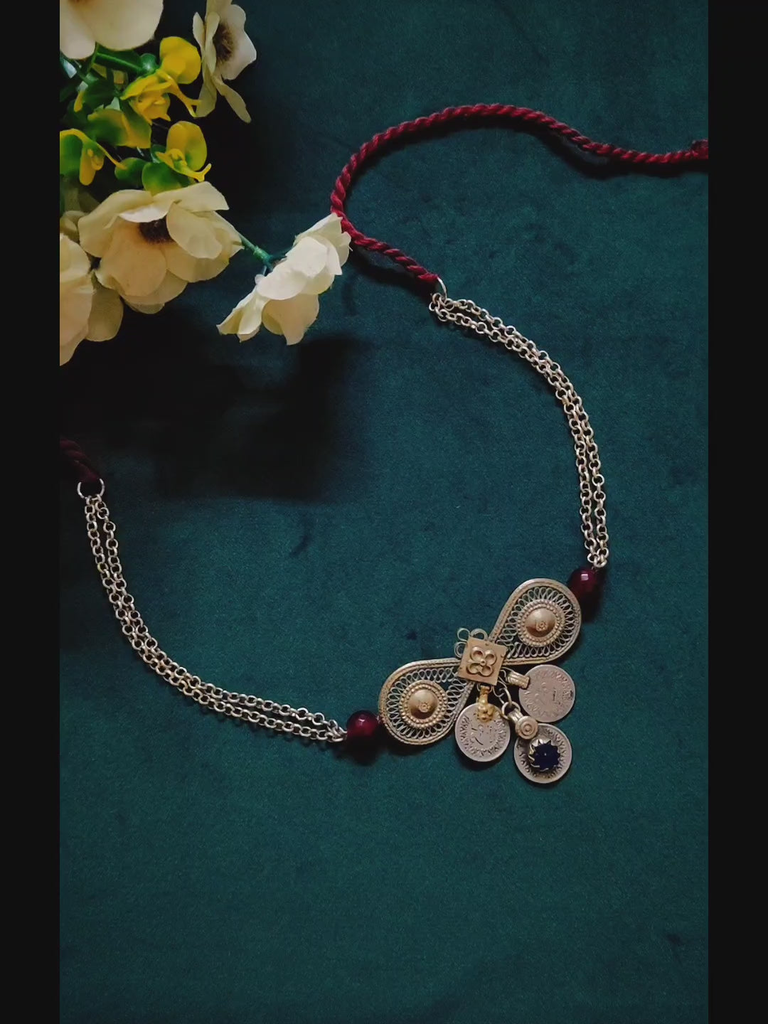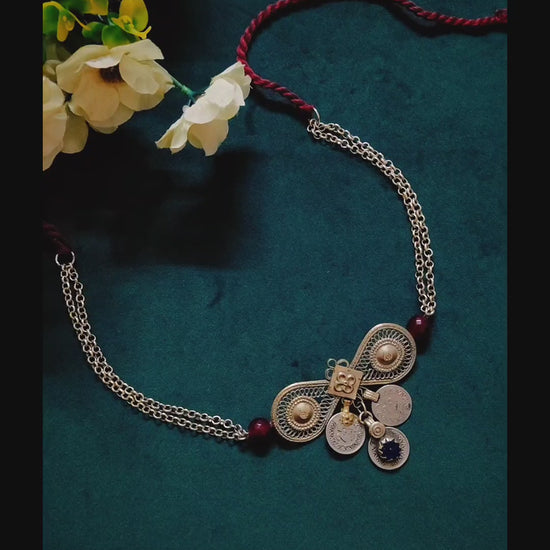 The central motif features delicate silver-tone filigree in twin paisley forms joined by a floral clasp element. Traditional coin charms and talismanic drops hang below, creating gentle movement — once meant to frame braided hair, now resting gracefully at the neckline.