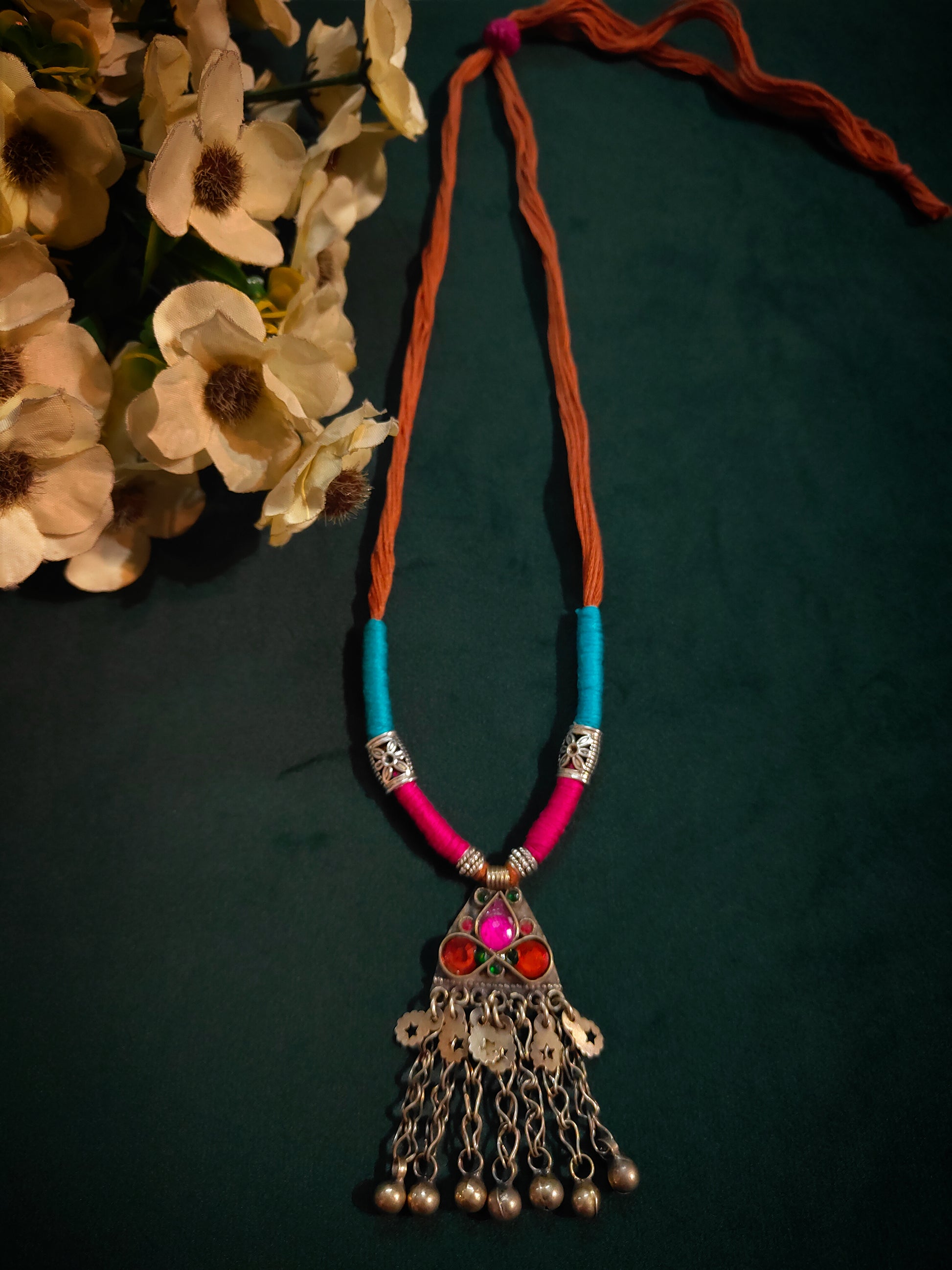 A gorgeous neckpiece featuring a classic tribal pendant paired with colorful hand-wrapped dori work. The length of the necklace is adjustable.