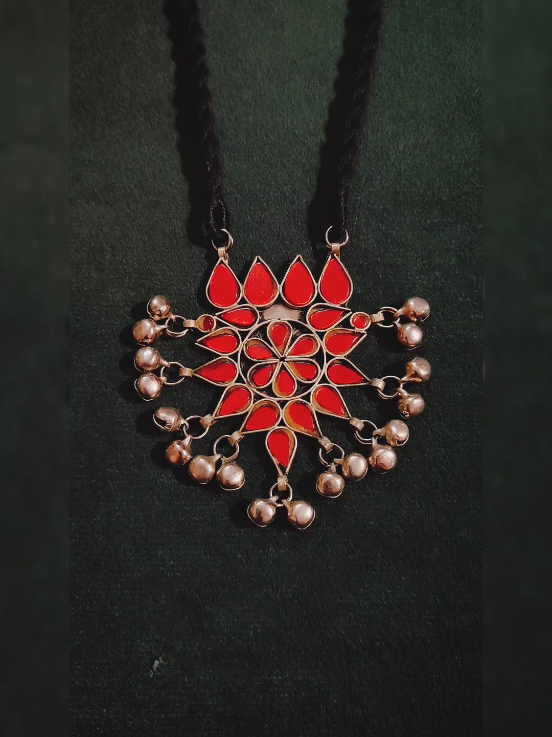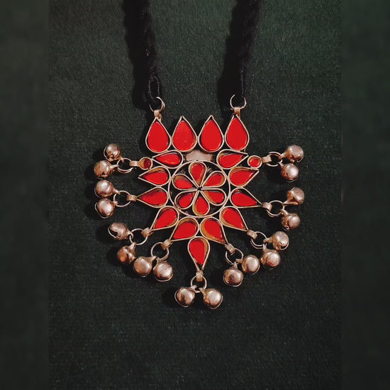 Afghan Pendant : The pendant is handmade. Its Lotus Shaped with bright red glass stones. Small ghunroo is attached to the pendant.